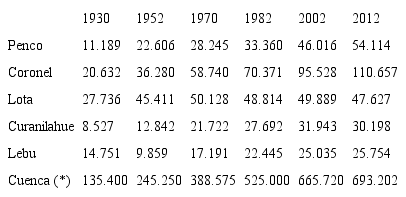 En los casos de Curanilahue10 y Lebu se observan situaciones similares a partir de la década de 1980, aunque menos acentuadas, estancándose la población en torno a los 30.000 y 25.000 habitantes, respectivamente. La ausencia de incremento demográfico, e incluso un leve decrecimiento de población, es un claro indicador de importantes procesos de emigración poblacional y declive urbano. La excepción la constituye Coronel, ciudad que en el mismo lapso pasó de los 58.000 habitantes a 110.000 en la década de 2010, si bien sus indicadores sociales continúan siendo deficitarios.