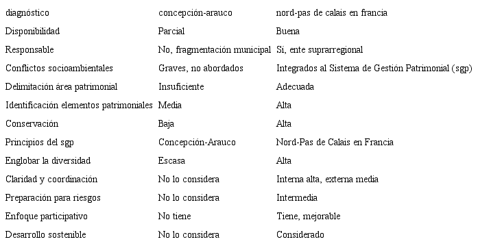 Analizando tanto las condiciones del patrimonio como la gestión de este en la última década en Concepción-Arauco y Nord-Pas de Calais en Francia, se observan dos realidades diametralmente opuestas (tabla 6). Por un lado, el caso chileno, aún estancado en la identificación de elementos patrimoniales y en la búsqueda de mecanismos para salvaguardarlo, sin haber siquiera delineado un sistema de gestión del patrimonio. Por otro, el francés, al adoptar la decisión de concebir el patrimonio minero de la cuenca como una sola entidad y asignarle recursos humanos y materiales, no solo avanza en la preservación del patrimonio, sino también en la elaboración de una estrategia territorial coherente, frenando el proceso de declive y mejorando las condiciones del ambiente habitado.