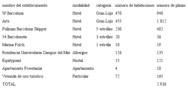 Los principales intermediarios turísticos que actúan en el barrio de la Barceloneta pertenecen al sector del alojamiento y lo hacen a través de portales web. Algunos, como Booking o Hostelworld, están centrados en la reserva de hoteles, mientras que otros, como Airbnb, se centran en el alquiler de pisos turísticos, sean legales o ilegales. Por ejemplo, una de estas plataformas de alojamiento reticular (Russo & Quaglieri, 2014), Airbnb, consta de 67 plazas de alojamiento entero, 61 habitaciones privadas y 3 compartidas. Este tipo de oferta actúa a través de portales web dedicados al alquiler de viviendas para uso turístico, lo que provoca un desequilibrio de su uso entre residentes y visitantes.