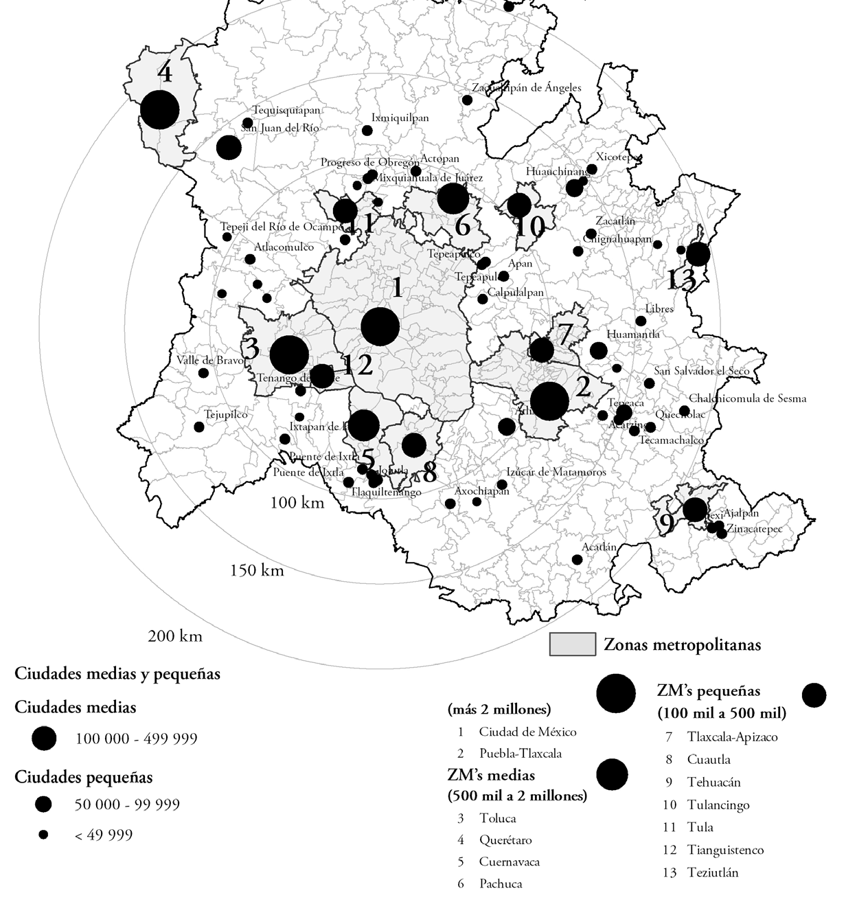 Respecto al tamaño de los centros urbanos y de las zonas metropolitanas, para este análisis se clasificaron de la siguiente manera: las zm grandes están representadas por las dos ciudades mayores de la región, la Ciudad de México y Puebla-Tlaxcala, prácticamente superiores a 3 millones de habitantes; las zm medianas son las del rango de 500.000 a menos de 2 millones de habitantes; y las zm chicas, aquellas cuya población es inferior a 500.000 habitantes. Por otro lado, las ciudades medianas son las que se encuentran en el rango de 100.000 a menos de un millón de habitantes, que no son zonas metropolitanas; y las ciudades chicas son aquellas de 15.000 a menos de 100.000 habitantes, que tampoco son zonas metropolitanas.4
