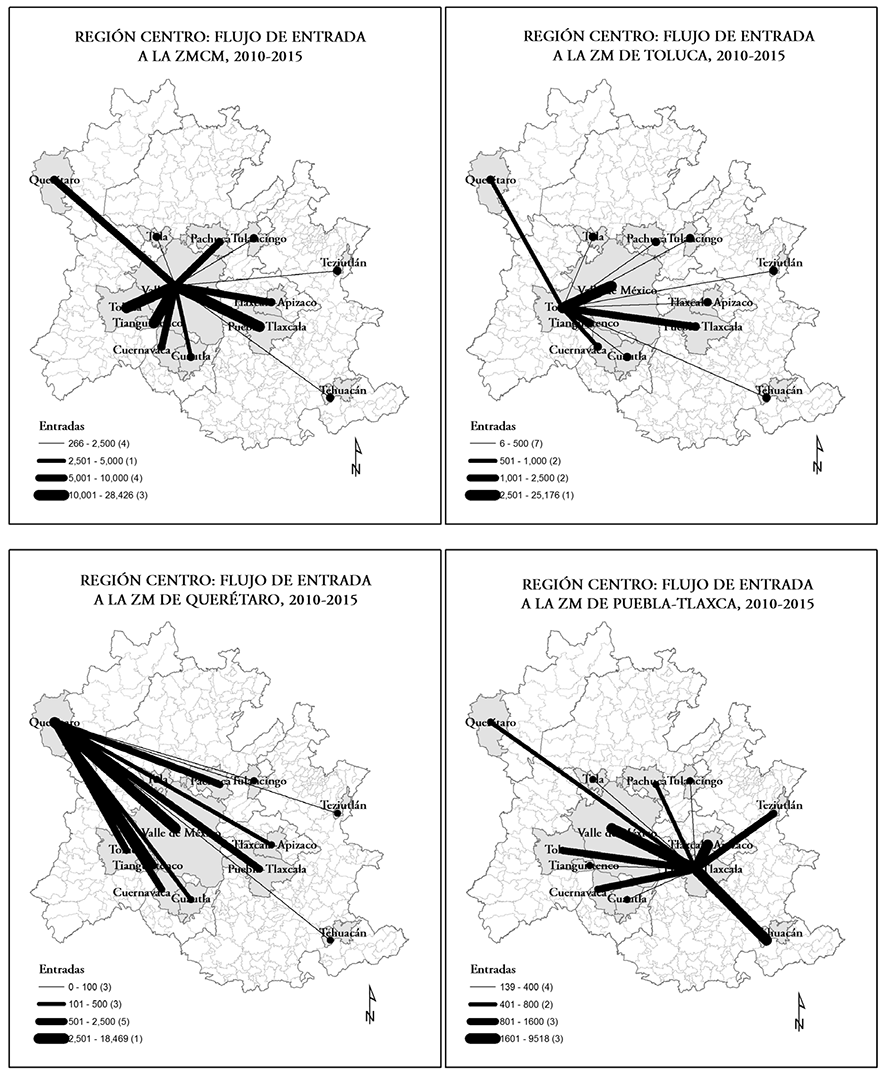 Pero, además, la zmcm dentro de su ciudad-región es un ejemplo típico de cómo actualmente las grandes metrópolis son claras protagonistas en una nueva etapa de reversión de los flujos migratorios entre categorías urbanas y rurales; después de haber constituido el destino principal de los flujos rurales-urbanos hace poco más de treinta años, actualmente se han convertido en centros expulsores de migrantes, y son activas participantes en las migraciones metropolitanas-metropolitanas. No obstante, aún reciben flujos continuos de migrantes secundarios, lo que las ayuda a seguir teniendo un gran peso específico en el sistema urbano mexicano. Todo indica que tal peso se seguirá incrementando, aunque claramente a un ritmo más lento, por la transición que ha experimentado hacia una economía terciarizada y por la desconcentración de funciones económicas hacia su subsistema urbano inmediato.