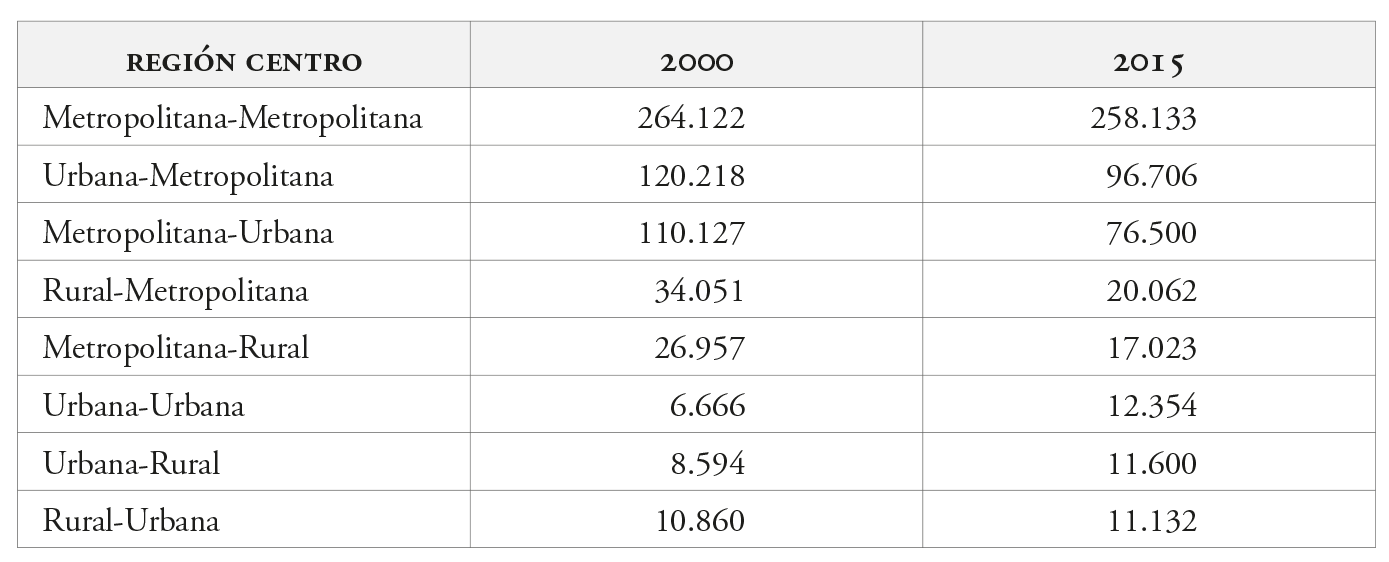 Como último punto y atendiendo a los tipos de flujos migratorios y a la magnitud de todos ellos dentro de la rc (tabla 6), hay que enfatizar que es la migración metropolitana-metropolitana la que involucra el mayor número de migrantes que se desplazan entre zm (51,3%); le sigue en importancia la migración urbana-metropolitana, con aquellos migrantes que se desplazan de centros urbanos chicos y medios a zm (19,2%); y en tercer lugar, la metropolitana-urbana, que incluye aquella población que se desplaza de todas las zm a centros urbanos chicos y medianos (15,2%). En el otro extremo, la tradicional migración rural-urbana (2,2%) y la rural-metropolitana (4,0%) han perdido importancia, considerando la magnitud del desplazamiento poblacional.
