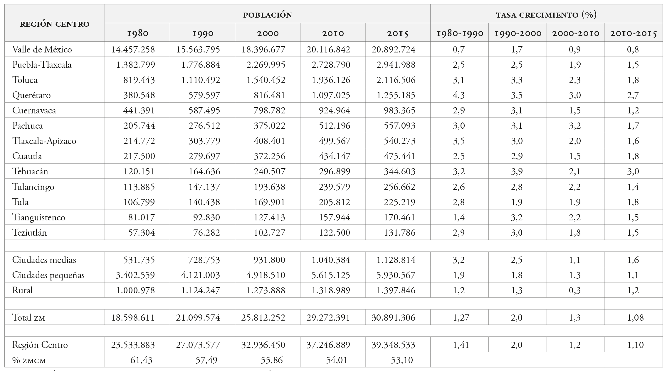 La zmcm es la gran metrópoli de la región y quizá por lo mismo ha experimentado una fuerte transformación en términos de flujos migratorios de entrada y salida; después de ser un nodo fuertemente atractor de migrantes, se convirtió en un núcleo expulsor en los últimos veinte años. El ritmo de crecimiento de zmcm es muy representativo de las tres fases ya descritas para la rc. Hasta los años setenta, la zmcm había crecido a tasas muy altas y había sido la ciudad de mayor atracción poblacional en el país debido al proceso sustitutivo de importaciones, que concentró en ella una alta proporción de actividad industrial; los movimientos migratorios rurales-urbanos alimentaron su crecimiento por varias décadas, alcanzando tasas por arriba del 5%; ello hasta que en la década de los años setenta su ritmo de crecimiento empezó a disminuir y las ciudades cercanas vieron aumentar su dinámica urbana como resultado de procesos desconcentradores de población y de actividad económica.