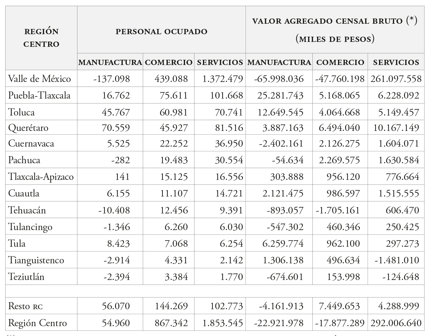 Ahora bien, considerando los centros urbanos atractores, es de destacar que las zm de tamaño medio (de 550.000 a prácticamente 2 millones) son las que presentan saldos migratorios positivos; ejemplos son Toluca, Querétaro, Cuernavaca y Pachuca; en el caso de las zm chicas sobresalen Tula y Cuautla. Con ello se nota una diversificación de destinos para los migrantes en nodos alrededor de la zm de la Ciudad de México tanto en ciudades millonarias como de tamaño intermedio, y con ello se confirma la desconcentración de oportunidades económicas a estos centros. Si examinamos los indicadores económicos de creación de empleo y de valor agregado censal bruto, observamos cómo efectivamente las zm mencionadas presentan incrementos importantes en ambas variables; sobresalen al respecto Toluca y Querétaro como las zm con la más alta generación de empleos, tanto en actividades terciarias como en manufactureras (tabla 4).