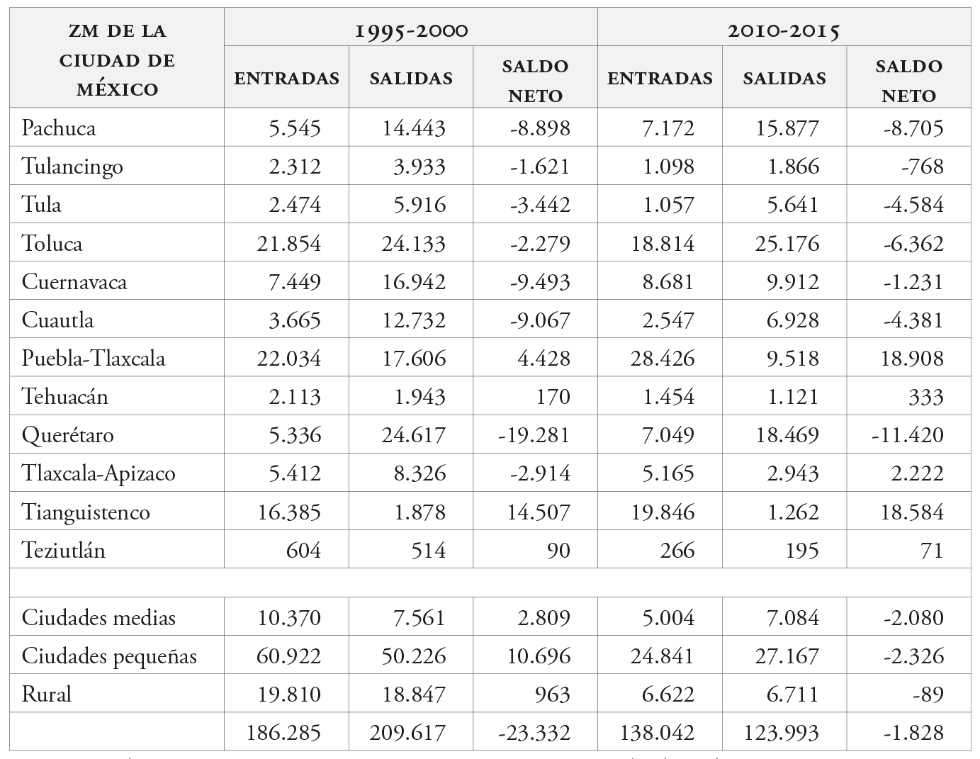 Los datos de saldos netos migratorios de los últimos veinte años entre centros urbanos muestran que, en términos generales, la zmcm ha sido francamente expulsora de población migrante, ya que mantenía saldos negativos con la mayoría de zonas metropolitanas y centros urbanos menores. Al analizar por rango tamaño los saldos migratorios de la zmcm a principios de siglo (1995-2000) y comparándolos con los de las demás ciudades, se observa que: (i) con la mayoría de zm de mayor tamaño (mayores a 500.000 habitantes) mantiene un saldo negativo; (ii) los principales destinos de la población migrante de la zmcm son zm de alta dinámica económica con un predominio de actividad industrial, o centros de servicios o capitales de mucha cercanía, como Toluca, Querétaro, Cuernavaca y Pachuca. Al respecto, la gran excepción es la zm de Puebla-Tlaxcala, la segunda ciudad en importancia en la región y con la cual se mantiene un saldo positivo, pues aún la gran metrópoli sigue siendo muy atractiva para los migrantes de esa zm, de la cual recibe una alta cantidad de migrantes. (iii) En el caso de las zm más chicas no existe un patrón regular: con algunas hay saldos negativos y con otras son positivos. Es interesante observar que en este mismo período se da una importante llegada a la zmcm de migrantes de ciudades medias no metropolitanas y de ciudades pequeñas, en las cuales se nota aún la fuerte atracción que ejerce la Ciudad de México sobre la población de las jerarquías urbanas menores.