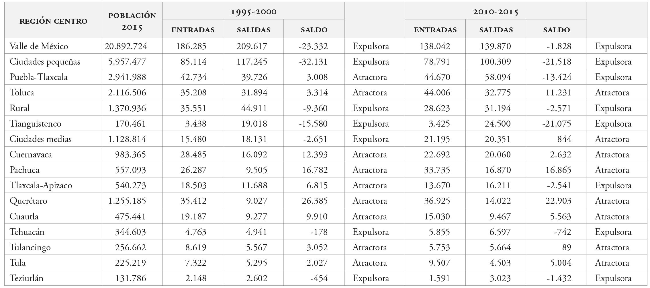 En esta sección se presentan los resultados del balance migratorio tanto de las zm como de las ciudades medias y pequeñas en dos períodos: a principios de siglo, 1995-2000, y quince años después, para el período 2010-2015. Según los resultados, se clasifican las ciudades en las categorías de expulsoras o atractoras. Para algunos centros urbanos se mantiene la categoría entre los períodos estudiados, pero para algunas ciudades estas categorías sufren un cambio significativo, que es muy indicativo de su dinámica económica (tabla 3).