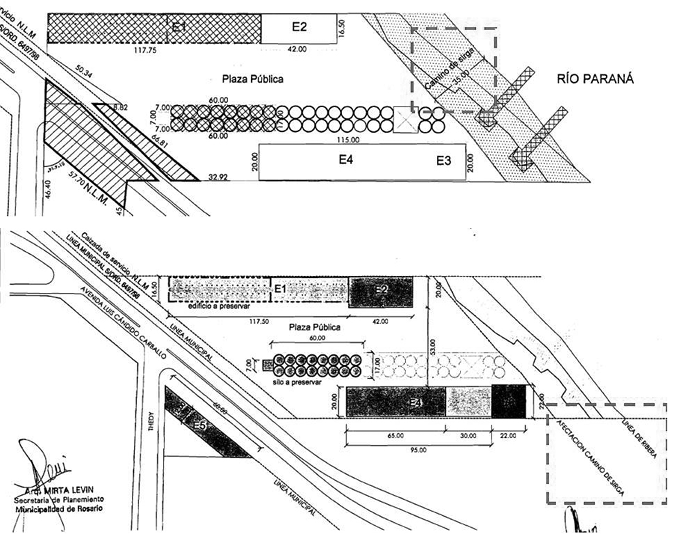 Se deberá respetar en toda la extensión los 35 metros correspondiente al camino de sirga establecido en el Art. 2340, inciso 4 y 2639 del Código Civil, y garantizar además, como mínimo, la libre circulación pública en toda la zona comprendida desde la línea del borde superior de la barranca actual hasta los 34 metros medidos perpendicularmente a esta, y hacia el oeste, con excepción de la superficie afectada a las construcciones autorizadas por la presente Ordenanza (Municipalidad de Rosario. Ordenanza 8320/08. Plan de Detalle ug 1 y 6. Artículo 7: Indicadores Urbanísticos y Usos del Suelo).
