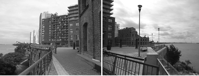 La conexión entre Puerto Madero y el sistema de espacios públicos de Buenos Aires es débil en la escala macro, en la dimensión estructural –por ejemplo, por la falta de medios de transporte masivo y la difícil accesibilidad peatonal, antes señaladas–, y más fuerte en la microescala, en la dimensión de la forma urbana –a partir del trazado de las manzanas y de la gran cantidad y variedad de calles y espacios públicos en general–. Puerto Norte, también en este sentido, pareciera ofrecer el ejemplo inverso. La conexión con el sistema de espacios públicos de Rosario es más fuerte en la escala macro, en la dimensión estructural –por ejemplo, por la continuidad del corredor verde costero–, y menos fuerte en la escala menor, en la dimensión de la forma urbana, principalmente a partir de la materialización de los bordes duros de las primeras unidades de gestión construidas. En esos casos, los límites administrativos de las ug parecieran constituirse como fronteras de pequeñas –y no tan pequeñas– urbanizaciones cerradas. Haría falta en esos casos la urbanidad de las manzanas y las esquinas, según la poética descripción de Solà-Morales (2004).