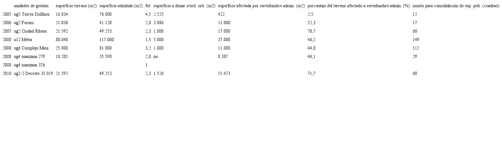 En la tabla 1 se resumen las compensaciones que la Municipalidad logró exigir en cada una de las unidades de gestión. Se incorporan los datos de superficie del terreno y los metros cuadrados habilitados, solo a los efectos de brindar una referencia adicional. No se consideran en este cuadro las obligaciones referidas a la materialización de las calles y los servicios, ya que se las considera parte del proyecto que cada desarrollador realiza. Las “cuadras” refieren a la cantidad de dinero que el desarrollador se compromete a aportar para la materialización del espacio público. Para actualizar ese valor se toma como referencia el costo de una cuadra de pavimento.