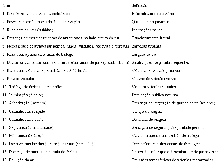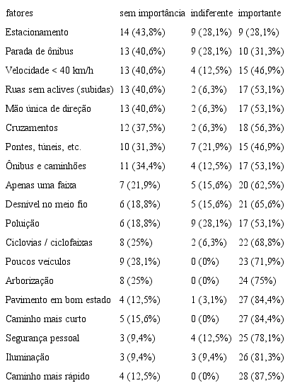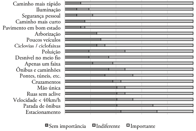 Por fim, cabe frisar a inserção implícita do fator ‘segurança viária’ nos itens relacionados à quantidade de veículos (‘poucos veículos’), composição e velocidade do tráfego (‘tráfego de ônibus e caminhões’ e ‘ruas com velocidade permitida de até 40 km/h’, respectivamente), possibilitando aferir sua importância de modo indireto.