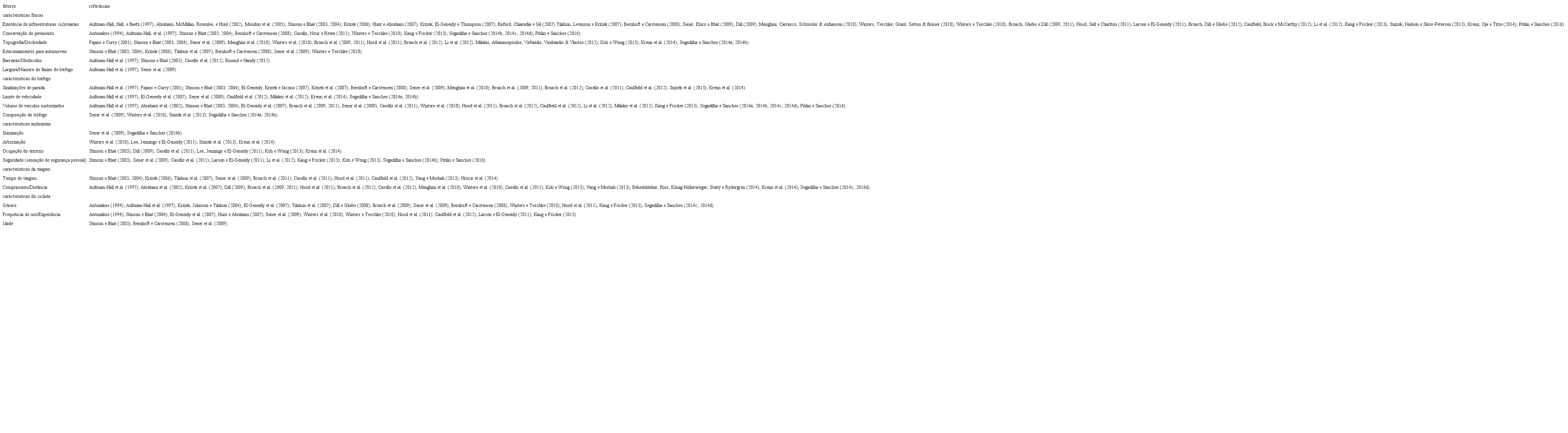 Agrupados por categorias, os estudos consultados durante revisão bibliográfica sobre os fatores que influenciam na escolha do trajeto ciclístico integram a Tabela 1. A maioria dos estudos examinados não engloba a realidade sul americana, tendo sido realizados, predominantemente, em países europeus e norte-americanos. Segadilha (2014) e Pitilin (2016), por outro lado, realizaram estudos no Brasil, elencando diversos fatores considerados importantes para a escolha da rota, identificados por meio de extensa revisão bibliográfica, e servindo de base para esta pesquisa.