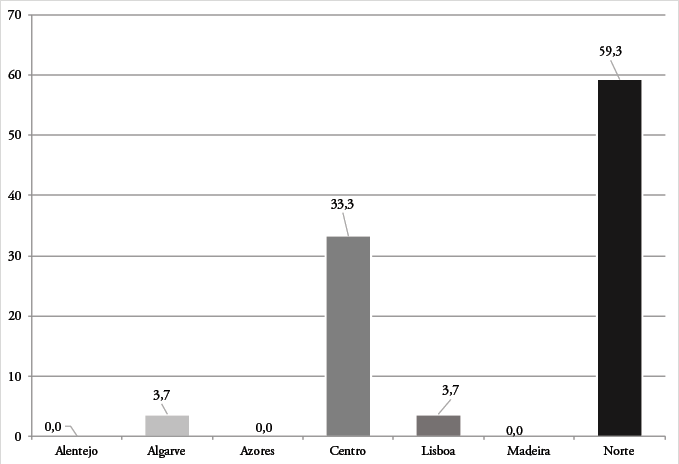 Geográficamente, y de acuerdo con el nivel 2 de la nuts (Nomenclatura de las Unidades Territoriales de Estadística), la mayor parte de los spl detectados se encuentran en el norte del país. Así, 16 de los 27 spl (casi el 60%) se localizan en la región Norte, situándose 9 en la región Centro (33%), estando los 2 restantes en Lisboa y en el Algarve, respectivamente (Figura 1). Esta concentración territorial de spl en Portugal se verifica incluso dentro de las regiones, principalmente en las proximidades de la costa atlántica. A modo de ejemplo, dentro de la región Norte es en la región de los ríos Ave y Tâmega donde se detecta un mayor número de spl; e igualmente, en la región Centro, son las áreas próximas al mar (la región entre los ríos Duero y Vouga, el Baixo Vouga o el Pinhal Litoral) las que cuentan con más spl detectados. Además, los spl identificados en Mafra (Lisboa) y Olhão (Algarve) también se caracterizan por su cercanía al mar, por lo que la distribución geográfica de spl en Portugal compartiría con la de otros países este rasgo característico (la proximidad a la costa), en consonancia con los preceptos de la teoría clásica de la localización industrial, y tal y como han constatado Boix y Galletto (2006) para el caso español.