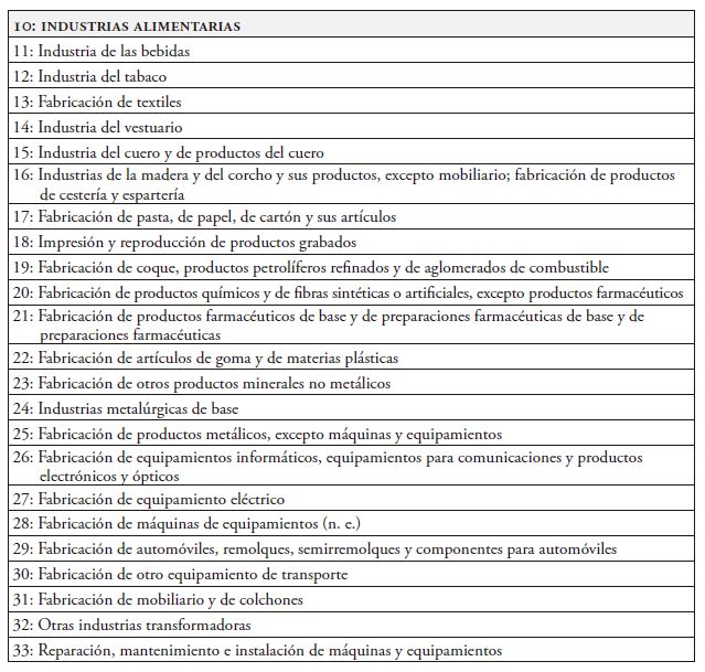 En otro orden, la clasificación de las actividades productivas que vamos a utilizar es la definida en Portugal por la cae Rev. 3, que reproducimos en la tabla 1. Estrictamente consideraremos las industrias transformadoras, designadas en el apartado C de esta clasificación, siendo las fuentes cuantitativas que utilizaremos para cotejar el cumplimiento de los criterios de la metodología de detección de spl las recogidas en la tabla 2.
