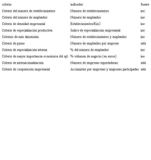 Criterio 6 de más dimensión. Que existan entre 10 y 19 establecimientos que generen como mínimo 800 empleos.Una vez que se han cumplido los cuatro primeros criterios y al menos uno de los que Lainé (2000) denomina “de más dimensión”, nos encontraríamos ante un spl, según los criterios establecidos en dicho trabajo. No obstante, como se comentó anteriormente, Giner, Santa María y Fuster (2006) han señalado algunas limitaciones de esta metodología. La más relevante es que no tiene en cuenta una de las características inherentes a la concepción teórica de distrito industrial, como es la predominancia de la pequeña y mediana empresa. Además, tampoco contempla la necesidad de verificar la existencia de una especialización interna dentro del spl, lo que es deseable, especialmente en aquellos spl que evidencian una especialización en más de una actividad productiva. Por estos motivos, sugieren la incorporación de los dos criterios siguientes a la metodología de detección de spl (criterios 7 y 8), que nosotros asumimos en nuestro estudio.