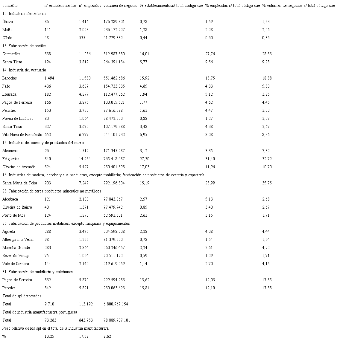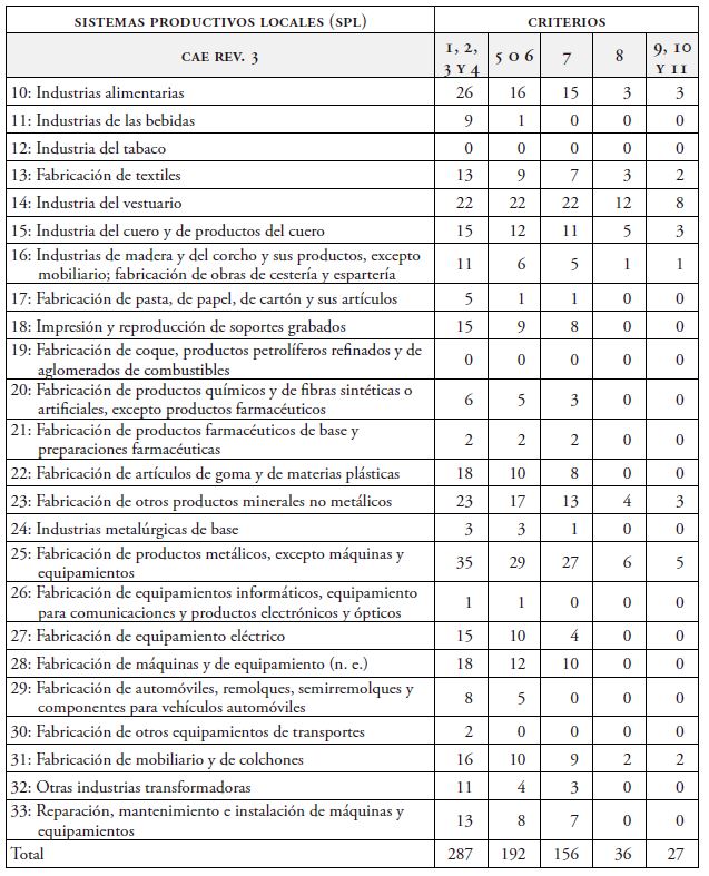 Si descendemos al nivel productivo, de las 23 ramas manufactureras consideradas (tomadas de la clasificación cae Rev. 3), la metodología aplicada ha permitido detectar spl en ocho de ellas: Industria del vestuario (6 spl); fabricación de productos metálicos, excepto máquinas y equipamientos (5 spl); industrias alimentarias (3 spl); industria del cuero y de productos del cuero (3 spl); fabricación de otros productos minerales no metálicos (3 spl); fabricación de textiles (1 spl); fabricación de mobiliario y de colchones (1 spl); industrias de madera y del corcho y sus productos, excepto mobiliario; fabricación de obras de cestería y espartería (1 spl); además de un spl de gran dimensión vinculado a las industrias de textiles y vestuarios, y de un spl poliespecializado en la industria textil y en la fabricación de mobiliario y colchones10.
