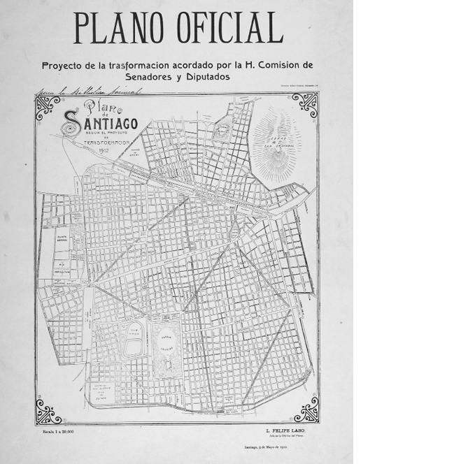 Cabe destacar que a pesar de los argumentos desfavorables al proyecto, este logró aprobarse en ambas Cámaras y ser publicado en junio de 1874 con algunas variaciones a la propuesta inicial, bajo el título “Apertura i prolongacion de calles i paseos públicos en la ciudad de Santiago”. La modificación de algunos artículos da cuenta de un intento por acotar el proyecto para que los fondos municipales no se vieran afectados de sobremanera, por lo que solo se incluyeron las reformas más urgentes, como, por ejemplo, la regulación de líneas y alturas de construcción. La importancia de esta ley radica en que es posible considerarla como lo que en la actualidad se conoce como un plan regulador de la ciudad. No solo proveía de soluciones urbanas para esos momentos, sino que también preveía una planificación futura, estableciendo las guías a las que debían apuntar las diferentes intervenciones (León, 1975). Para este fin, Benjamín Vicuña Mackenna (1873), en su cargo de intendente de la Provincia de Santiago, encargó al ingeniero Ernest Ansart la creación de un plano de la ciudad en el que se plasmaran estas directrices (figura 1).