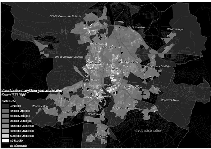 A partir de la demanda media de calefacción de cada clase, ha sido posible caracterizar las necesidades energéticas de calefacción de forma simplificada para todas las viviendas de una sección censal (figura 1). Con este indicador de demanda se asume que, durante el invierno, los hogares están a una temperatura adecuada y, por tanto, se evalúa la situación a partir de la suposición de que todos los habitantes tienen derecho a condiciones de confort mínimas.