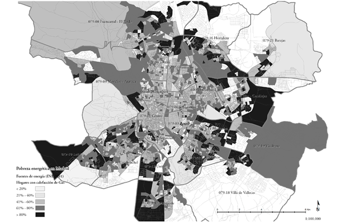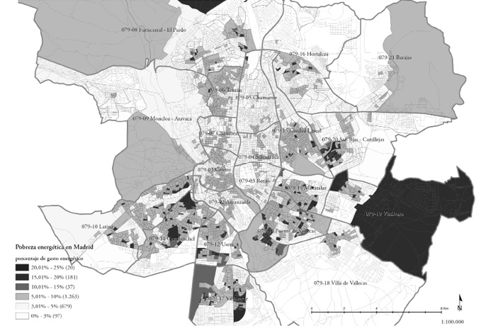 En el caso del municipio de Madrid, la pobreza energética resulta ser un fenómeno exclusivo de la periferia urbana. Se constata que se produce una acumulación de circunstancias causantes de la pobreza energética en los mismos barrios: demandas energéticas altas por mala calidad de la edificación, instalaciones de calefacción ineficientes mediante radiadores eléctricos y bajos niveles de renta.