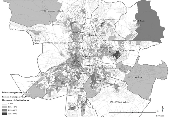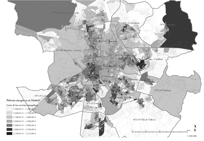 El objetivo general es la estimación de un indicador de pobreza energética desarrollado a partir del cálculo de la demanda energética para calefacción de la edificación residencial y del nivel de renta medio de los hogares para el municipio de Madrid. El ámbito de estudio está constituido por las áreas urbanas. Los datos se utilizan a escala inframunicipal, con la máxima desagregación posible: la sección censal. Las secciones son un referente geográfico de carácter estadístico y constituyen un instrumento eficaz tanto en trabajos censales o padronales, como para investigaciones por muestreo y en el Censo Electoral. Se desarrolla el indicador de pobreza energética con el objeto de incluirlo en el conjunto de indicadores sintéticos a partir de los que es posible delimitar ámbitos de vulnerabilidad integral, llamados barrios vulnerables (Temes, 2014).