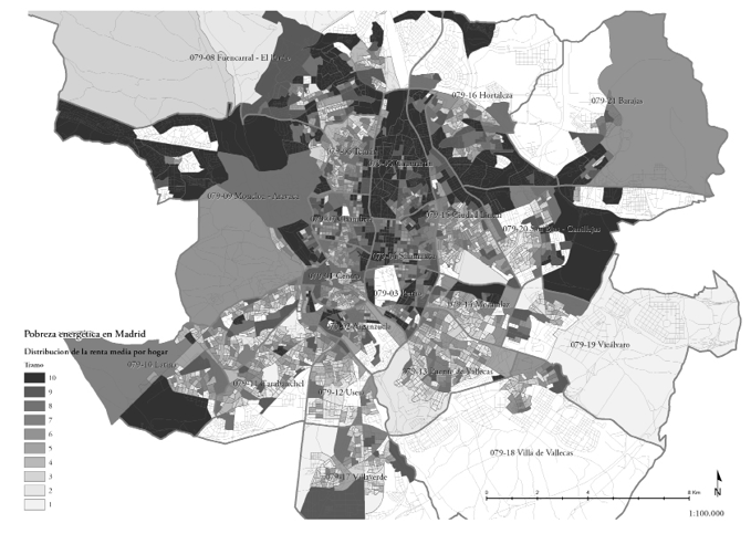 Para la estimación del riesgo de pobreza energética se ha utilizado el modelo de ingresos y gastos inspirado en el trabajo de Sánchez-Guevara Sánchez (2015), a partir del análisis de datos estadísticos y las características térmicas de la edificación. Para el estudio a la escala de barrio se comparan los datos de ingresos medios por hogar de cada sección censal (nivel de renta media), con el promedio del gasto equivalente en facturas energéticas en los hogares que contiene, estableciendo el umbral de la pobreza energética en el 10% de la renta.