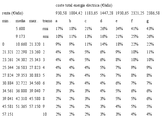 Se demuestra que la estructura tarifaria española deriva en un coste mayor por kWh para los consumos energéticos más bajos. Esta situación penaliza tanto a los hogares que incorporan medidas de mejora de la eficiencia energética, como a aquellos que se encuentran sufriendo situaciones de pobreza energética y carecen de recursos para hacer frente al costo de la energía suficiente para lograr el confort en sus viviendas. Esto se traduce en que las rentas más bajas, que intentan reducir gastos mediante el ahorro de combustible, reciben una mayor presión en la factura, a pesar de no satisfacer sus necesidades de confort. Además, esta situación desincentiva a aquellos hogares pertenecientes a los niveles de renta más altos, que podrían permitirse la inversión en la eficiencia energética pero no reciben estímulo, puesto que la repercusión de las mejoras en la factura energética resulta amortiguada.