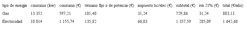 Para el cálculo del consumo energético total, se añade al coste del suministro de energía para calefacción al del resto de los servicios, conforme a las estimaciones del idae (4403,7kWh). Para estos usos se ha considerado, de forma simplificada para todos los casos, que se utiliza la energía eléctrica. Estos valores se suman al consumo de energía para calefacción. Se entiende que en el caso de las viviendas con calefacción eléctrica no procede computar por segunda vez la cantidad correspondiente al término de potencia y, por lo tanto, se ha sumado únicamente en la estimación de la factura correspondiente a las viviendas que se calientan por gas. El gasto correspondiente a otros usos sería de 819,20 €/año para la vivienda con calefacción de gas natural y de 646,43 € año para la que tiene calefacción eléctrica.