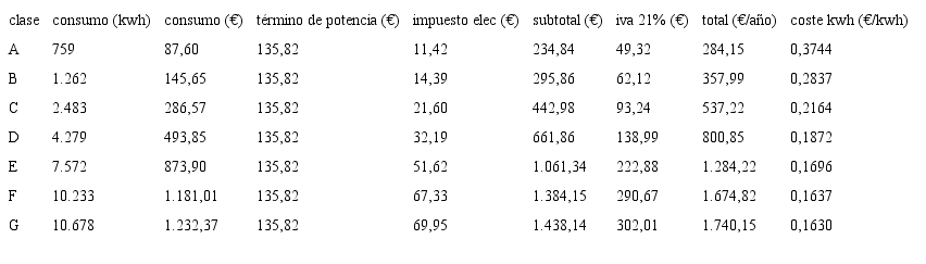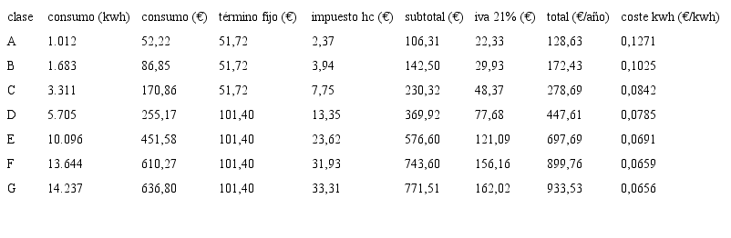 Siguiendo estos mismos pasos, es posible hallar una estimación aproximada de los consumos energéticos de calefacción que tendrían las diferentes calidades energéticas conforme a las distintas clases de demanda (para la vivienda de tamaño medio), siendo la clase a la más eficiente y la g la que más energía demanda. Se calcula el consumo energético (kWh) necesario para satisfacer la demanda energética para cada clase energética de la escala establecida en el procedimiento de certificación. En el caso de la clase energética g, no es posible utilizar un valor medio; en consecuencia, se ha utilizado el valor límite para caracterizar las viviendas que se encuentran en esa circunstancia, que son las de peor calidad térmica de la ciudad.