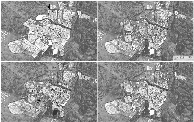 A este respecto, se ha definido un conjunto de cinco usos generales en los que agrupar cada una de las actividades de planta baja estudiadas. La figura 2 muestra una primera cartografía temática para el conjunto de la ciudad, ordenada según las categorías nominales de espacio libre (izquierda-superior), equipo urbano y servicios públicos (izquierda-inferior), uso terciario (derecha-superior) e industrial (derecha-inferior), en el que identificar el patrón de distribución de los diferentes usos agrupados.