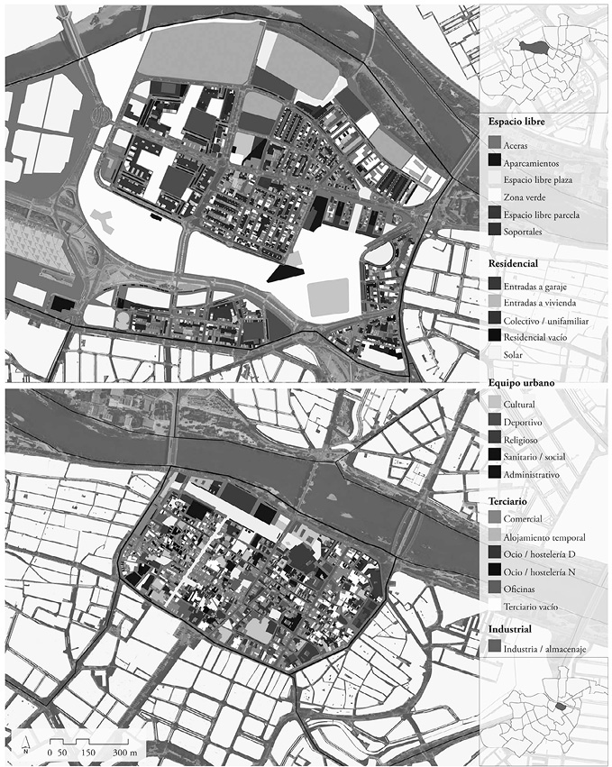 Cada una de estas categorías presenta niveles de desagregación mayores, según nivel de especialización y condición de uso en activo o cese de actividad. La figura 3 ofrece un mapa más en detalle, a nivel de barrio, en el que se compara los usos específicos en planta baja de dos barrios de la ciudad de Zaragoza ubicados ambos en su margen derecha, correspondientes a La Almozara y Casco Histórico, por considerarse contrastables no solo morfológicamente, sino en relación con el marco temporal en que se inscribe su desarrollo urbano y su condición de vulnerabilidad.3