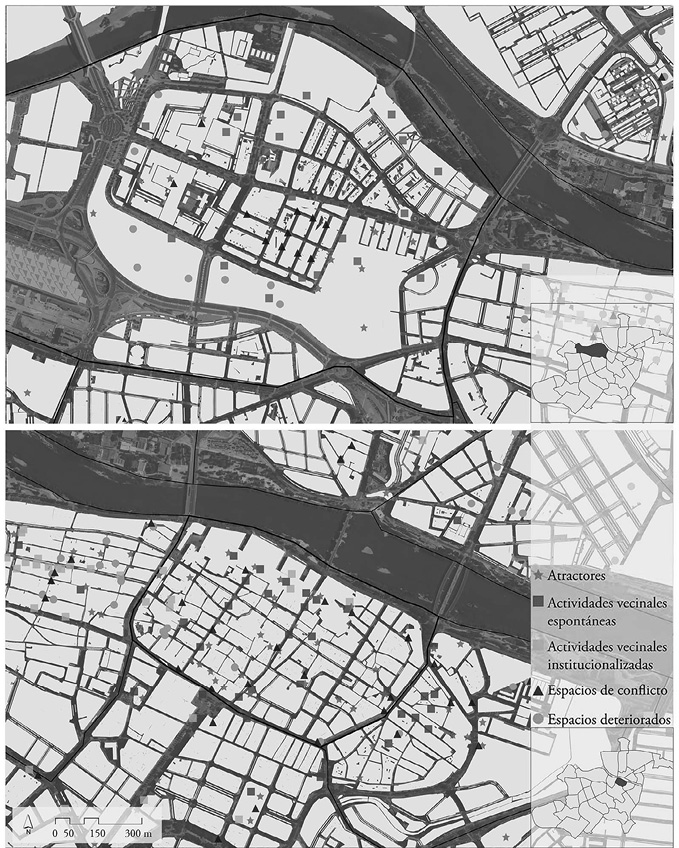 Esta información se obtiene a través de técnicas observacionales y conversacionales de investigación cualitativa; entre ellas, la observación presencial del espacio público según un guion de observación, y la realización de entrevistas en profundidad estructuradas a informantes clave. La guía de observación permite generar información homogénea para el conjunto de los barrios analizados acerca del uso de los espacios urbanos, incorporando especificidades como frecuencias, intensidades y perfil de población que lo frecuentan y otorgando especial importancia a la identificación de espacios de riesgo y deteriorados. Por su parte, las entrevistas a informantes clave permiten complementar el análisis de cada barrio con un aporte de información proporcionado por determinadas personas que gozan de una especial vinculación con el barrio (García-Bueno, 2017). Contar con una cartografía de los elementos que caracterizan el nivel de convivencia y riesgo a nivel de barrio es importante, puesto que de su estudio puede extraerse información precisa acerca no solo del patrón de distribución y conformación de la red de atractores, sino también de la influencia que ejercen las actividades vecinales (por ausencia o presencia) en el espacio urbano y en la aparición de áreas de riesgo y de atractores. Esta aproximación también permite plantear una gradación de tales redes de convivencia y apoyo social de cada uno de los barrios con respecto al resto. Las metodologías previas no tienen en consideración la red de apoyo social y, en general, queda asumido que un barrio caracterizado como vulnerable no va a contar con una valiosa red de apoyo social. Sin embargo, esto no se ha puesto en medida. Para comprobar hasta qué punto existe relación entre la condición de vulnerabilidad y los patrones de relación social en la ciudad, el trabajo no solo ha considerado los barrios caracterizados como vulnerables por el informe publicado por el Observatorio de Vulnerabilidad Urbana, sino que ha ampliado el estudio a otros barrios de la ciudad. Continuando con el ejemplo a escala de barrio anterior, la figura 4 refiere un ejemplo de cartografía social que se ha obtenido como resultado de aplicar esta metodología, en la que se distinguen los atractores, actividades vecinales (espontáneas e institucionalizadas), espacios de conflicto y deteriorados para los barrios de La Almozara y Casco Histórico.