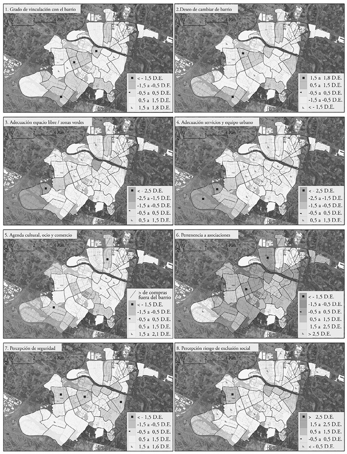 El enfoque metodológico queda complementado por el diseño y realización de una encuesta desde una perspectiva cualitativo-estructural, formada por 36 preguntas –de respuesta tanto cerrada como, en determinados casos, abierta–, agrupadas de manera temática y orientadas a obtener información precisa acerca de la caracterización del barrio con respecto al conjunto de la ciudad, y ello en torno a tres aspectos básicos: sentimiento de pertenencia al barrio, intensidad de uso del espacio urbano e intensidad de relaciones sociales. El trabajo de campo se realizó durante los meses de junio de 2015 y noviembre de 2016. Una exhaustiva explicación sobre el diseño de la encuesta se puede encontrar en Cámara y Sorando (2017). La generación de este tipo de información permite establecer una gradación de los barrios según cuáles de sus espacios públicos, centros de asistencia primaria o locales de pequeño comercio son mejor valorados, y qué ámbitos de la ciudad y del barrio no alcanzan a proporcionar un servicio suficiente, según los propios vecinos. En otras palabras, este análisis de los hábitos y acciones de cotidianeidad por parte de los habitantes de los barrios permitiría comparar la distribución real de los elementos que caracterizan el barrio con respecto a los presentes en el imaginario colectivo. La información generada relativa a la percepción subjetiva de estos tres aspectos básicos parte del conocimiento local y se concreta en la definición de las siguientes variables: sentimiento de pertenencia al barrio (grado de vinculación con el barrio; deseo de cambiar de barrio), intensidad de uso del espacio urbano (adecuación del espacio libre y zonas verdes; adecuación de servicios y equipo urbano; agenda cultural, ocio y comercio) e intensidad de relaciones sociales (pertenencia a asociaciones; percepción de seguridad; percepción de riesgo de exclusión social). El análisis exploratorio de los datos generados para cada una de las ocho variables a través de la realización de las encuestas responde a la variabilidad de la distribución representada en la figura 5.