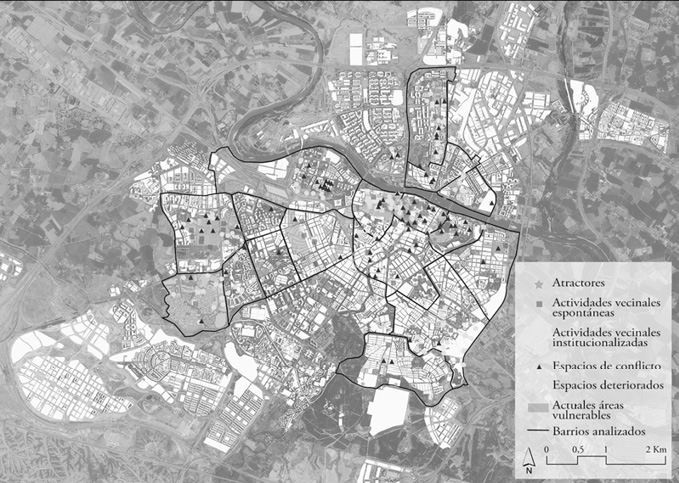 La localización y puesta en medida de la red de convivencia y apoyo social ha demostrado que, en términos de vulnerabilidad, las actuales metodologías aplicadas en el ejercicio de la planificación deben ser evaluadas y mejoradas para adaptarse a una realidad social en gran medida desconocida. Se ha comprobado que el supuesto de partida, por el que se consideraba que un barrio caracterizado como vulnerable no cuenta con una red de apoyo social, no se cumple. Se ha demostrado, así, que el riesgo de aislamiento social no es mayor en las áreas vulnerables identificadas por las anteriores metodologías de evaluación de riesgo y vulnerabilidad urbana. En este sentido, se ha cartografiado las relaciones de cotidianeidad, con objeto de que los resultados del análisis espacial realizado puedan ser instrumentalizados para incorporar con garantías el ámbito de lo social en el desarrollo y diseño de la ciudad. La metodología empleada permite inferir los riesgos potenciales que afectan a la convivencia a nivel de barrio, por lo que adquiere un carácter necesario y complementario (no sustitutivo) a las actuales metodologías, además de considerarse como un documento valioso de carácter informativo a los ciudadanos, a sumar a los actuales documentos vigentes de planificación y gestión de la ciudad. La metodología de análisis empleada permite obtener información geoespacial para la caracterización de los conceptos de vulnerabilidad y exclusión social, hasta ahora fundados de manera esencial en el carácter físico y morfológico de la ciudad.