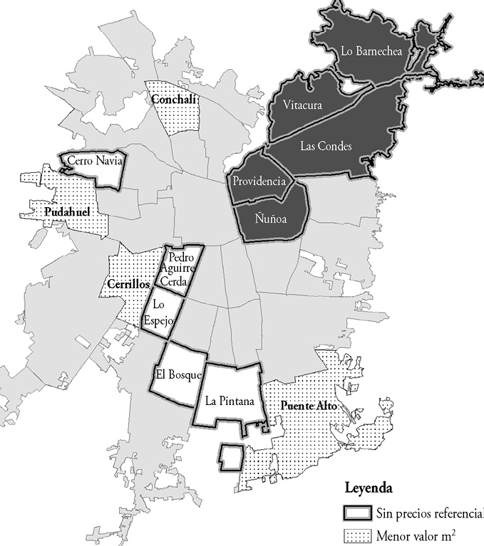 En el otro extremo, se ve que las comunas peores evaluadas en el Índice de Calidad de Vida Urbana de Comunas y Ciudades de Chile (icvu), como El Bosque, Cerro Navia, Pedro Aguirre Cerda, La Pintana y Lo Espejo, no cuentan con precios referenciales, ya que son sectores donde el mercado privado no está desarrollando unidades de viviendas nuevas. Ello es preocupante, en el sentido de que si el mercado inmobiliario privado no incentiva la construcción de nuevos espacios que inviten a nuevos grupos a vivir en estas comunas, difícilmente se desarrollará un mejoramiento de tales territorios. Es interesante realizar un análisis más profundo de esta situación en otra investigación.