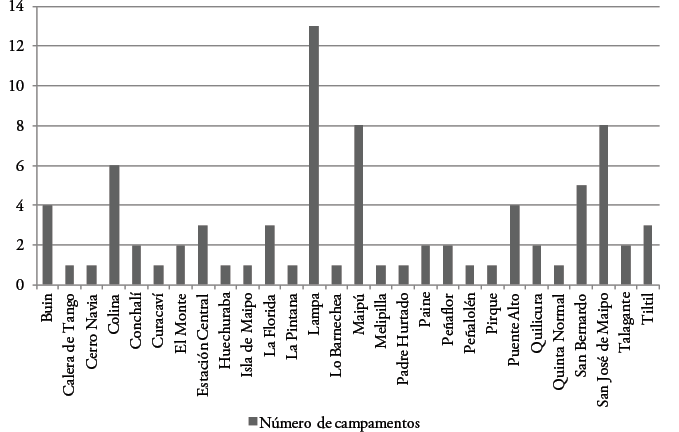 La figura 6 muestra que en la actualidad existen ochenta campamentos en la Región Metropolitana, de los cuales la gran mayoría se ubica en el sector periférico de la región, destacando comunas como Lampa, Colina, para el sector norte, y Pirque y San José de Maipo hacia el sur.