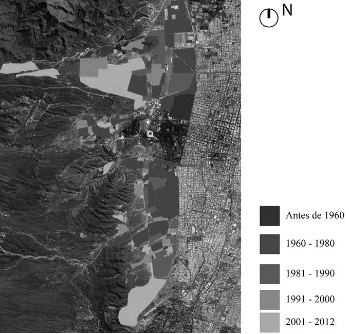 Secretaría de Ambiente y Ordenamiento Territorial (2017). Sistema de Información Ambiental Territorial (siat). Crecimiento urbano hacia el piedemonte, por períodos. [en línea] http://www.siat.mendoza.gov.ar/data/geonode:crecimiento_urbano