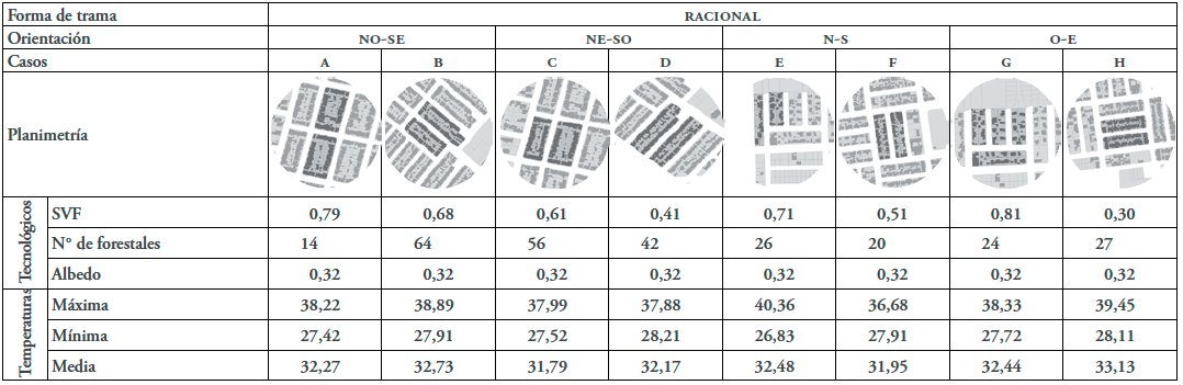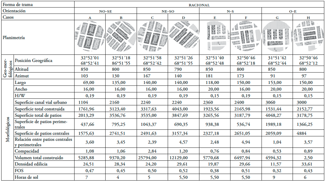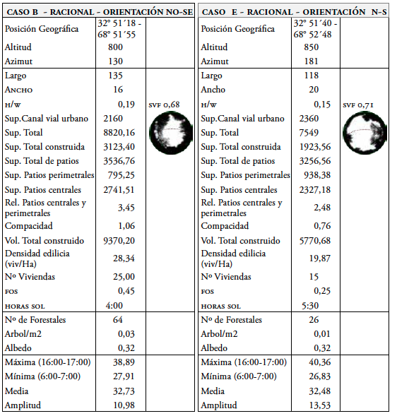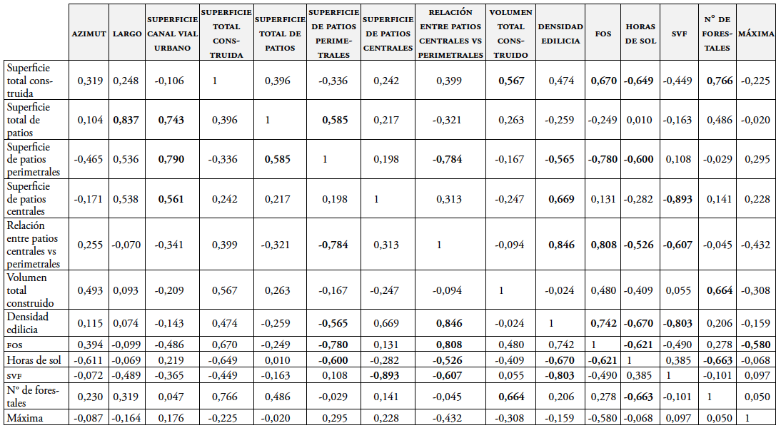 Por último, en la tabla 4 se observa el conjunto de variables consideradas para el análisis del comportamiento de la temperatura media: superficie del canal vial, svf, relación superficie de patios centrales y perimetrales, fos, densidad edilicia y horas de sol.