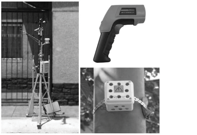 Las campañas con mediciones móviles tuvieron por objeto monitorear un conjunto más amplio de variables microclimáticas. Para ello se utilizó una estación del tipo HoboWeatherStation®, instalada sobre un soporte móvil que permite desplazarla a distintos puntos (se monitorearon cuatro puntos por hora en cadacvu). El periodo de medición con las estaciones móviles comprendió desde las 9:00 hasta las 19:00 horas. En esta campaña se registraron, cada 15 minutos, las variables de temperatura y humedad relativa del aire, temperatura del punto de rocío, velocidad y dirección del viento, presión atmosférica y radiación solar. Simultáneamente se registraron los valores de temperaturas superficiales (vertical-paredes y horizontal-calle y vereda) con un termómetro infrarrojo tipo Fluke 66, y se determinaron los factores de visión de cielo de cada caso mediante el análisis de imágenes hemisféricas digitales. La figura 4 muestra una imagen de los equipamientos utilizados.