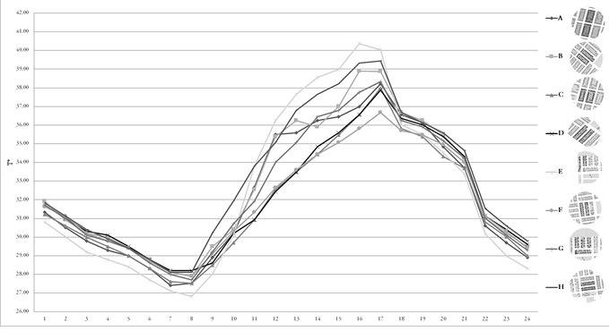 En la figura 5 se presenta el comportamiento de la curva de temperatura del aire para cada uno de los casos monitoreados para un día típico correspondiente al área de estudio. En ella se muestran los comportamientos de los ocho casos monitoreados del día 20 de enero de 2017. Se seleccionó este día ya que es representativo de las condiciones climática del amm (día claro, con elevada heliofanía y baja velocidad de vientos y humedad relativa).