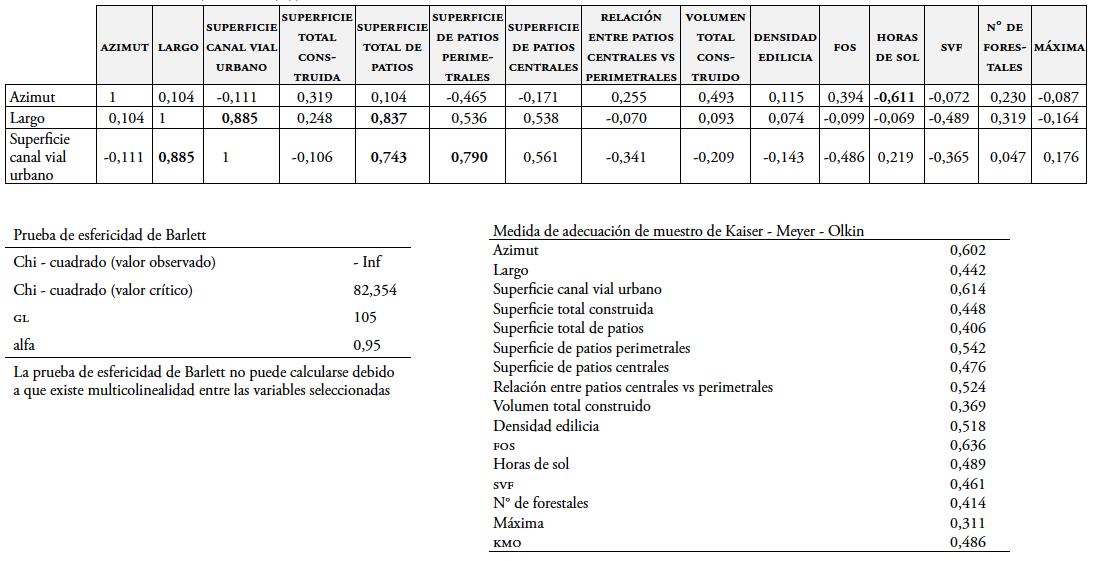 Cuando se repite el proceso anterior, se observa un comportamiento semejante en cuanto a las temperaturas mínima y media. En ninguno de estos casos puede realizarse la prueba de esfericidad de Barlett, debido a la existencia de colinealidad entre las variables. Los valores de kmo son 0,512 para el caso de la matriz que contiene la temperatura mínima y 0,475 para el análisis que contiene la temperatura media. El análisis de la matriz de correlaciones muestra que: la temperatura mínima correlaciona significativamente con el largo del canal vial (0,515), la superficie de patios centrales (0,582), la densidad edilicia (o,562) y el svf (-0,650); es decir, presenta máxima correlación con un indicador morfotecnológico, dos indicadores morfológicos que refieren a la configuración de la manzana y un indicador morfológico que refiere a la trama. Por su parte, la temperatura media correlaciona con el azimut (-0,565), la superficie de patios centrales (0,590) y el volumen total construido (-0,702); es decir, con un indicador geomorfológico y dos indicadores morfológicos que refieren a la estructura de la manzana.