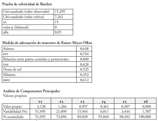 Mediante el análisis de componentes principales, se pudo explicar el grado de dependencia de las temperaturas urbanas y detectar, de un conjunto de 19 variables o indicadores seleccionados inicialmente para caracterizar los espacios evaluados, aquellos de mayor peso. Con esto fue posible reducir a seis las variables que explican o permitirían controlar el comportamiento de la temperatura urbana a lo largo del día: azimut, factor de visión de cielo (svf), relación entre patios centrales y perimetrales, densidad, factor de ocupación de superficie (fos) y horas de sol (hs).