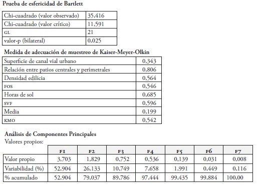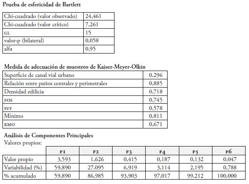 En el caso de las temperaturas mínimas, las combinaciones de variables que permiten un adecuado acp son: superficie del canal vial, relación superficie de patios centrales y perimetrales, fos, densidad edilicia y svf (tabla 3).