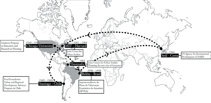Las asesorías realizadas por Friedmann entre finales de la década de los cincuenta y principios de los sesenta en América Latina (Brasil y Venezuela) y Asia (Corea), van a constituirse como la base preparatoria para la construcción del andamiaje teórico-conceptual de un tipo de planificación aplicable a los países subdesarrollados. En Brasil trabaja como docente de planificación regional (1956-1958) en el programa de la Superintendência do Plano de Valorização Econômica da Amazônia (spvea). Radicado en la ciudad de Belém, se encarga del dictado del seminario Teoría de la Planificación, área de experticia adquirida en sus años de formación en el programa interdisciplinario en planificación, economía y geografía de la Universidad de Chicago bajo la dirección de Harvey Perloff en los inicios de la década de los cincuenta (figura 1).