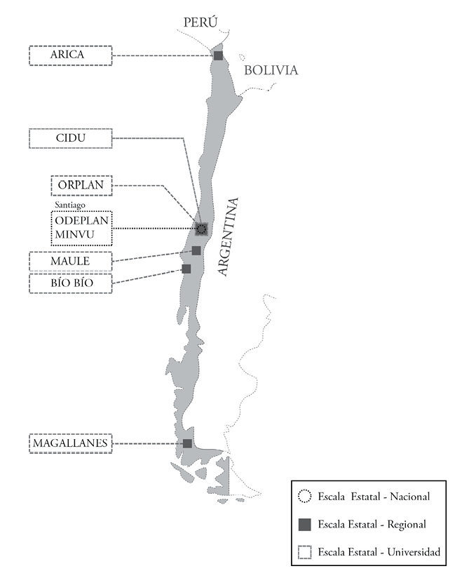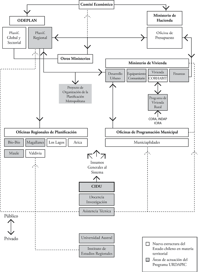 Con el gobierno de Frei Montalva transitando su primer año de gestión y el correspondiente inicio de la modernización de la estructura institucional del Estado, la reformulación de Urdapic se orientó a la “creación de capacidades institucionales necesarias para actuar eficazmente frente a los cambios generados por el proceso de urbanización que se está experimentando en Chile” (Fundación Ford, 1968, p. 02). En esta línea, la acción se plantea multiescalar (nacional, regional y local/urbana) y multiinstitucional (Estado y universidad), y se establecen asesorías con organismos existentes, apoyándose la delineación y perfeccionamiento de las técnicas de planificación y, por último, el trabajo específico en la definición de políticas públicas. Los vínculos propuestos por Urdapic permiten visualizar las áreas de colaboración: un esquema que articula condiciones políticas locales con el financiamiento externo y el asesoramiento técnico de expertos extranjeros.8 La asesoría se estructuró en tres escalas institucionales: i) la nacional-estatal, a partir de los vínculos con Odeplan y el Minvu; ii) la escala estatal-regional, con las Oficinas Regionales de Planificación dependientes de Odeplan, línea en la que se prestó asesorías en tres de las cinco sedes propuestas (Magallanes, Biobío y Maule), más la incorporación posterior de la Junta de Adelanto de Arica; y iii) la academia como último plano de actuación de Urdapic, a través de la colaboración y financiación para la creación del Comité Interdisciplinario de Desarrollo Urbano y Regional (cidu, 1966) en la Pontificia Universidad Católica de Chile. Este nuevo centro se ubicó en el organigrama como el espacio de provisión de insumos generales para la “capacitación permanente de profesionales en las disciplinas que interesan” (Fundación Ford, 1968, p. 07), que abastecía al Estado de profesionales capacitados en las nuevas técnicas de planificación tanto en la escala nacional como en la regional.9