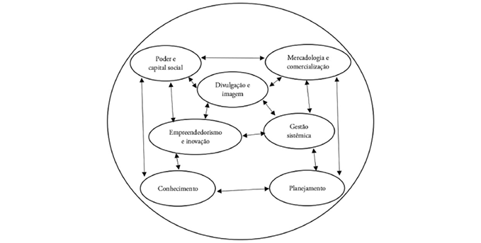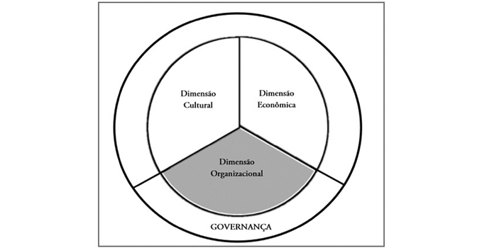 Para viabilizar a integração dos elementos da dimensão econômica e cultural do turismo, Tomazzoni (2007) define como estruturantes da dimensão organizacional, os seguintes elementos: “poder e capital social”, “gestão sistêmica”, “divulgação e imagem”, “mercadologia e comercialização”, “planejamento, empreendedorismo e inovação e conhecimento” representados na figura 1.