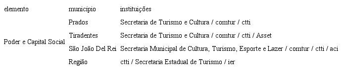 De acordo com Tomazzoni (2007), o elemento poder e capital social consiste nas organizações, entidades e empresas públicas e privadas que exercem poder econômico, poder político e poder simbólico sobre as decisões do Turismo em cada município.