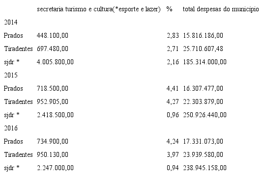 Somente os municípios de Prados e Tiradentes possuem Secretaria Municipal exclusiva de Turismo e Cultura. O Município de São João Del Rei detém uma secretaria integrada de cultura, turismo, esporte e lazer, dividida em superintendências. Deste modo, o orçamento divulgado no portal de transparência do município possui valores globais das secretarias e não subdivididos por superintendências, comprometendo, assim, uma análise precisa de investimentos realizados, especificamente, na área de cultura e turismo.