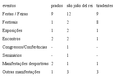 São João Del Rei possui uma boa infraestrutura como centro de convenções, auditórios, teatros capazes de sediar eventos com um grande número de pessoas. Tiradentes possui tradição em sediar grandes festivais, como o Festival de Gastronomia, Tiradentes Vinho e Jazz Festival, Mostra de Cinema, entre outros. Prados, apesar de possuir infraestrutura limitada e pouca tradição em grandes eventos, atraindo turistas de várias regiões. Como exemplo, pode-se citar o Carnaval de Rua, Festival de Música, Exposição Agropecuária e Feira Artesanal.