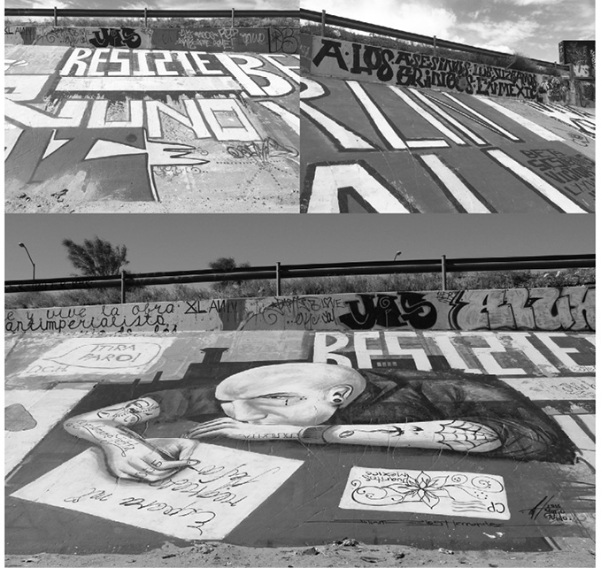 En primera instancia, se señala que los murales en la zona de cruce del puente Paso del Norte han cambiado tres veces en un periodo de dos años de documentación y registro. Por ejemplo, el mural del colectivo Rezizte (figura 9) se ha vuelto una imagen emblemática en el lugar. Si bien los demás pueden desaparecer o ser intervenidos con el tiempo, este mural permanece casi intacto. Así, a través de tres años, el mural solo ha sido rodeado, mas no borrado ni intervenido.