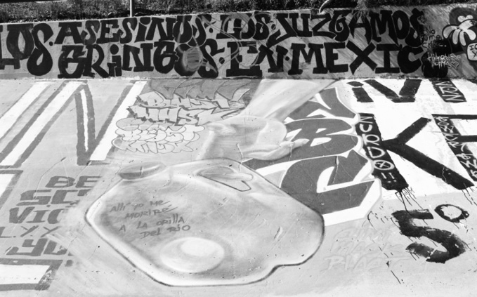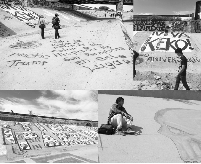 fotografías cortesía de eugenio abraham puente (2017)En la zona de cruce de los puentes hermanos Paso del Norte-Stanton, no solo los puentes son elementos urbanos importantes, sino también el canal y dos puentes ferroviarios. Aquí destacan manifestaciones de arte como intervenciones político-culturales, murales con temáticas de reclamo, pintas,4 grafitis, gráfica urbana en general y acciones de arte y performance (figura 4). Las frases que sobresalen son: “Pinche Trump”, “Toda la gente pobre, de color, Hispana, No son permitidos en este Lugar”, “¡Viva keko! 5° Aniversario”. El texto de esta última pintura se refiera a un grupo de niños que jugaban en bicicleta en el canal junto con Sergio, Keko para sus amigos, pasando por los charcos de un lado a otro. Al verlos, la patrulla fronteriza les gritó y ellos respondieron con piedras. Se escuchó un disparo, que alcanzó a Sergio. Un policía del lado mexicano vio lo ocurrido, por lo que corrió para responder en defensa del niño. Su compañero lo detuvo, sujetándolo fuertemente, para calmarlo. Fueron llegando refuerzos al lugar por ambos lados: un niño tendido en la línea, una disputa (¿bélica?) en espera. Hasta hoy la justicia no ha resuelto la muerte de Sergio, y cada año, debajo del puente Negro, en el cruce internacional entre México y Estados Unidos en Ciudad Juárez, Chihuahua-El Paso, Texas, la familia y amigos pintan mensajes en su memoria, en la memoria de todos.