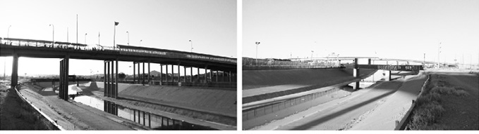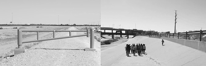 Estas dos imágenes muestran distintas zonas dentro de una línea de 55 km aproximadamente, de frontera entre las dos ciudades. Izquierda: Bordo de terreno natural de tierra y el cauce seco del río Bravo. Derecha: Uno de los recorridos sobre el bordo de concreto cercano a los puentes internacionales de cruce; en el margen izquierdo de la imagen, el canal de concreto del río y el cauce del río Bravo. En el bordo del lado mexicano se puede caminar al lado del río, sea en el cauce natural o en el canal de concreto.